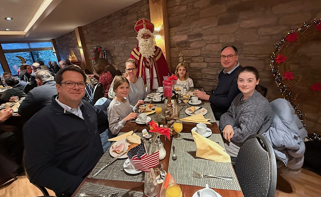 THANKSGIVING – das amerikanische Fest mit Familie und Freunden – feierten Vereinsmitglieder, Teilnehmer des Elementary Exchange und des High School Exchange drei Tage nach dem diesjährigen Datum. Noch bevor am Dreiländereck der obligatorische Truthahn serviert wurde, begrüßten die Vorsitzende Frau Dr. Kösters und die Oberbürgermeisterin von Aachen, Frau S.Keupen, die nahezu 100 anwesenden Gäste. Zudem gab sich Sinterklaas die Ehre.